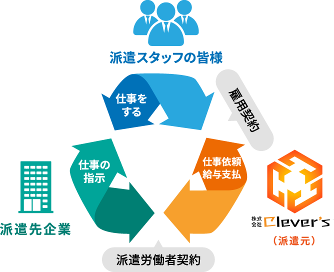 派遣という働き方は、派遣会社に登録したスタッフが、派遣先企業にて業務に従事する仕組みです。雇用契約や給与の支払いはClever’sが行い、実際の勤務場所は派遣先企業となります。